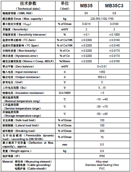 德國HBM稱重傳感器MB35C3/2.2T產品參數:NyP廣州南創電子科技有限公司