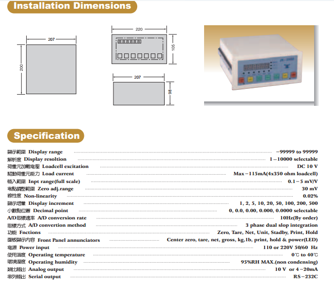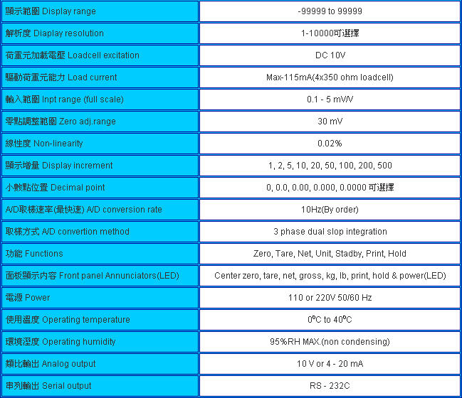 產品描述:臺灣JIHSENSE JS-2000_JS-2000顯示器系高功能高精度顯示器,本顯示器針對應變規式感測器所設計,有絕佳的穩定性,類比信號可提供+/- 10V或4-20mA輸出,A-D採用最精確的雙斜率積分方式,每秒鐘取樣10次,本顯示器所有設定工作均由前面版的按鍵輸入,特別設計的總重修正功能,可讓使用者精確調整重量,使校正工作快速精確。