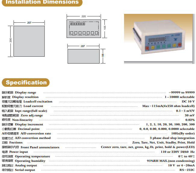 臺灣JIHSENSE JS-320_JS-320稱重顯示控制器可標配本品牌所有模擬荷重元規格: