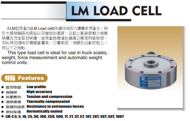 本LM型荷重元(LM Load cell)係最常用的力量量測荷重元,由於大面積穩固的底座以及極低的高度,並配上高敏度剪力彈力結構及完全密封保護,使荷重感應達到最高之精度與敏感度,因此特別適用於精確重量測、力量測試、地磅及自動控制上,具以下之特點: