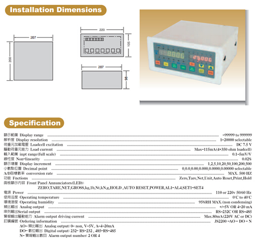 臺灣JIHSENSE JS-2200稱重顯示控制器規格圖: