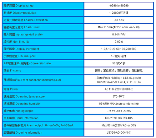 臺灣JIHSENSE JS-2200稱重顯示控制器參數圖: