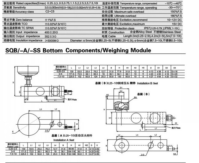 SQB-7.5T傳感器溫差穩定度: 每3°C變化 , 電壓漂移0.03%