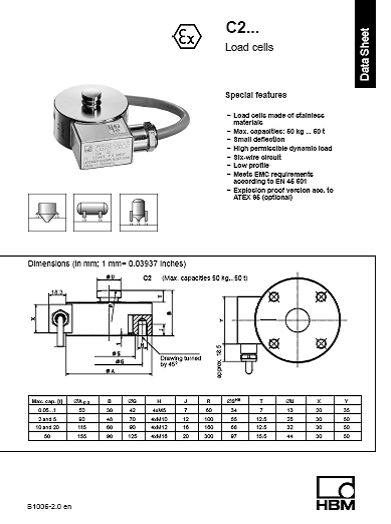 C2 系列是防銹蝕材料制成的力傳感器,應用于壓力測量等方面,提供極高精度 ,并可進行靜態和動態測量,結實,可承受高動態負載.