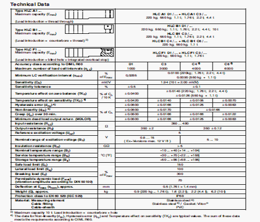 德國HBM HLCA1C3/220kg稱重傳感器技術參數圖: