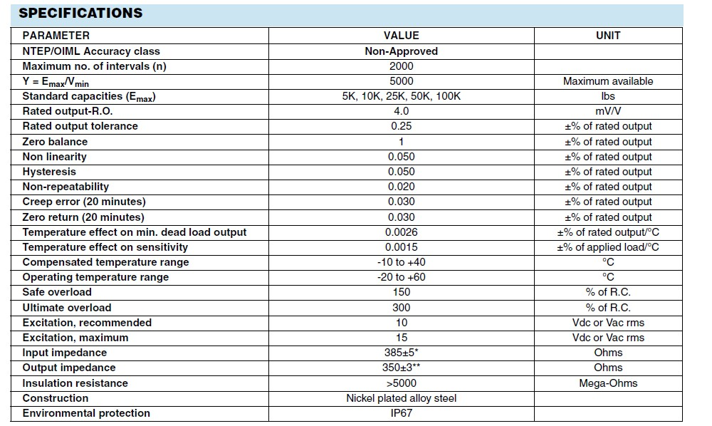 美國(guó)世銓Celtron LCD-25klb稱重傳感器技術(shù)指標(biāo):