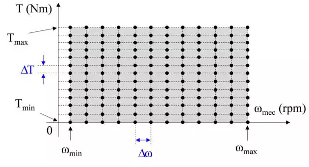 速度范圍 (ωmax-ωmin) 被分成多個(gè)等間距 Δω,合理的數(shù)量為 10 到 20。每個(gè)速度,扭矩變化也同樣按合理的點(diǎn)10到20,分成步進(jìn) ΔT 。結(jié)果就獲得了 扭矩-轉(zhuǎn)速 網(wǎng)格圖,包含 N = n x m 個(gè)點(diǎn)。