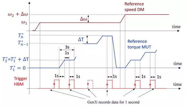 如圖所示,一個(gè)操作點(diǎn)持續(xù)了3秒。電機(jī)控制器產(chǎn)生了一個(gè) TTL 信號給 HBM 數(shù)據(jù)記錄儀,當(dāng)上升沿觸發(fā)被檢測到,數(shù)據(jù)記錄儀存儲了一秒的數(shù)據(jù)。按照所選操作點(diǎn)的數(shù)量,完整的過程持續(xù)了10到20分鐘。