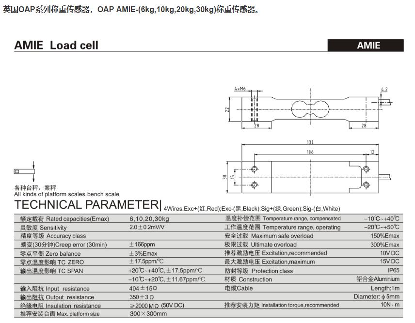 柯力 AMIE-20kg稱重傳感器型號類別技術參數選型安裝等資料信息,如果有關