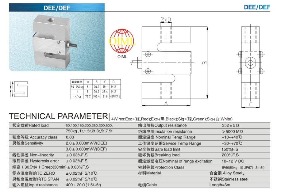 vyB廣州南創(chuàng)電子科技有限公司量程可選:DEE型稱重傳感器DEE--50kg/100kg/150kg/200kg/250kg/300kg/500kg/750kg/1t/1.2t/1.5t/2t/3t/5t